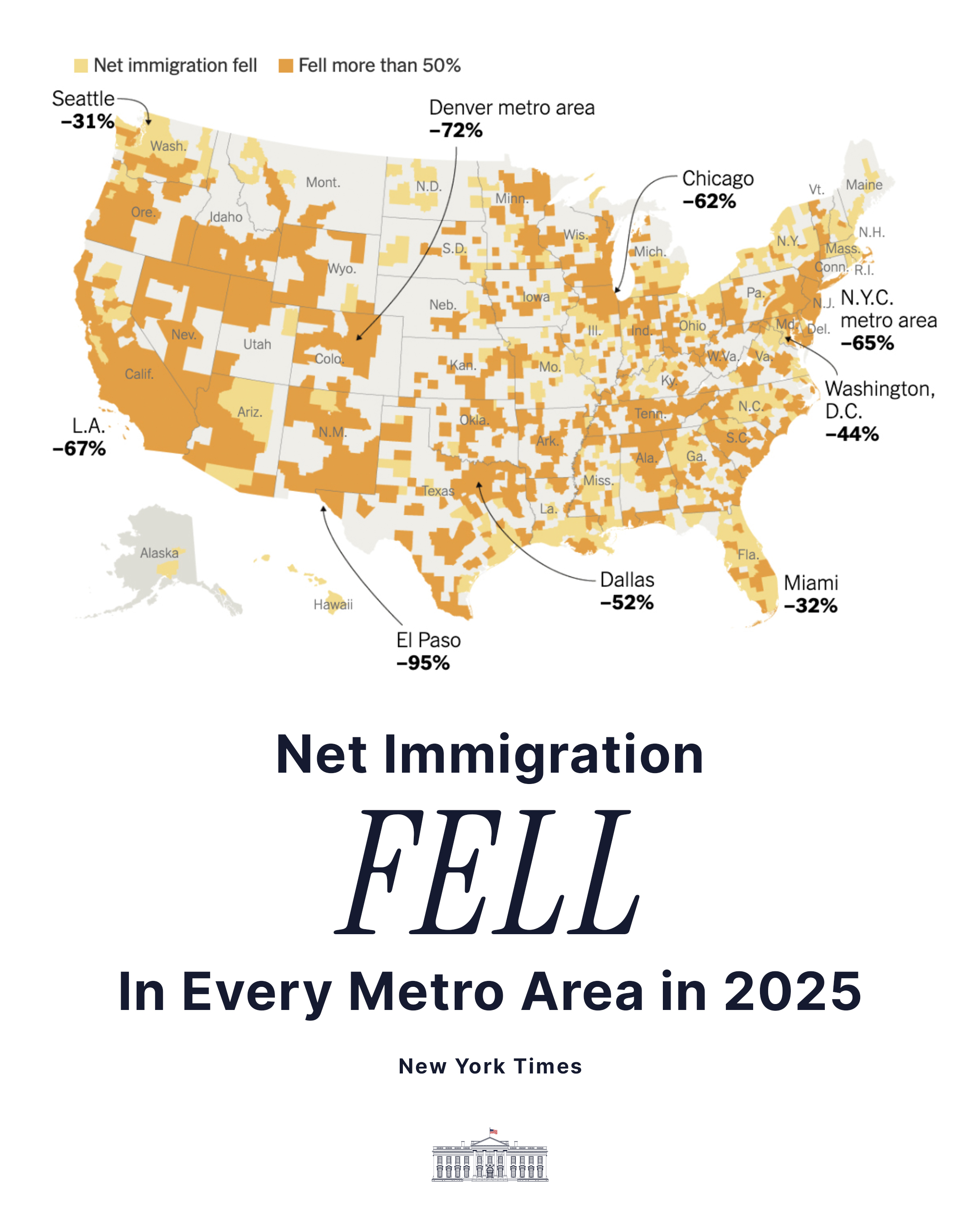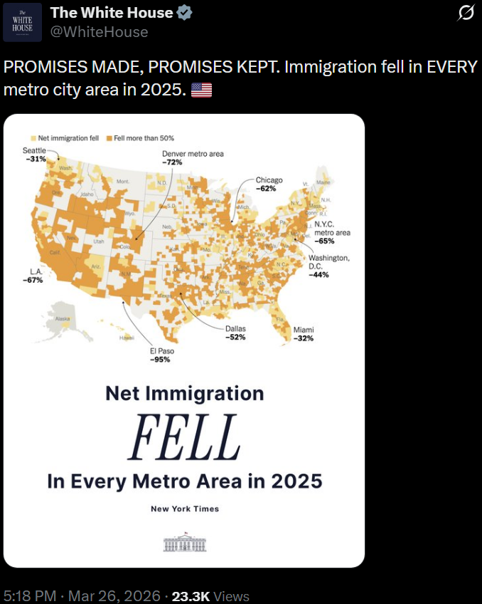 [063]PROMISES MADE, PROMISES KEPT. Immigration fell in EVERY metro city area in 2025. 🇺🇸 media link media link