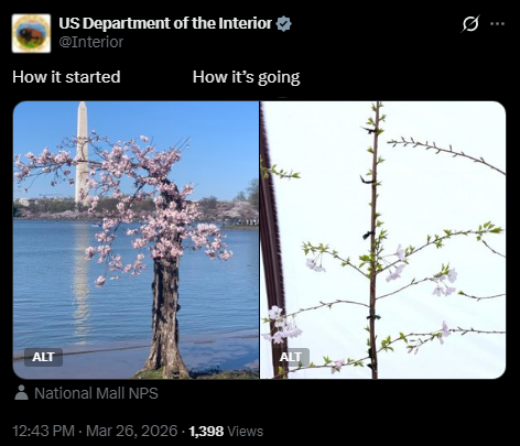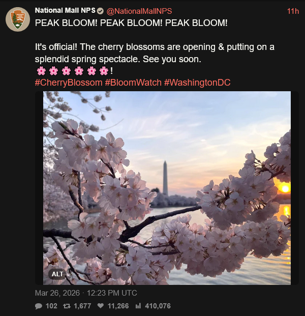 [090]@NationalMallNPS It's official! The cherry blossoms are opening & putting on a splendid spring spectacle. See you soon media link