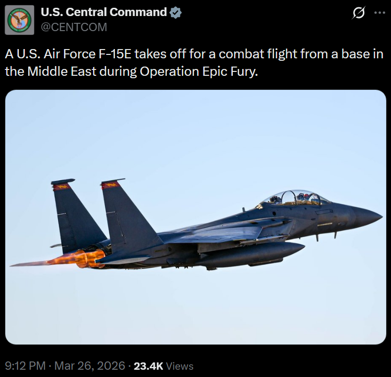 [097]@CENTCOM U.S. Air Force F-15E takes off for a combat flight from a base in the Middle East during Operation Epic Fury media link media link