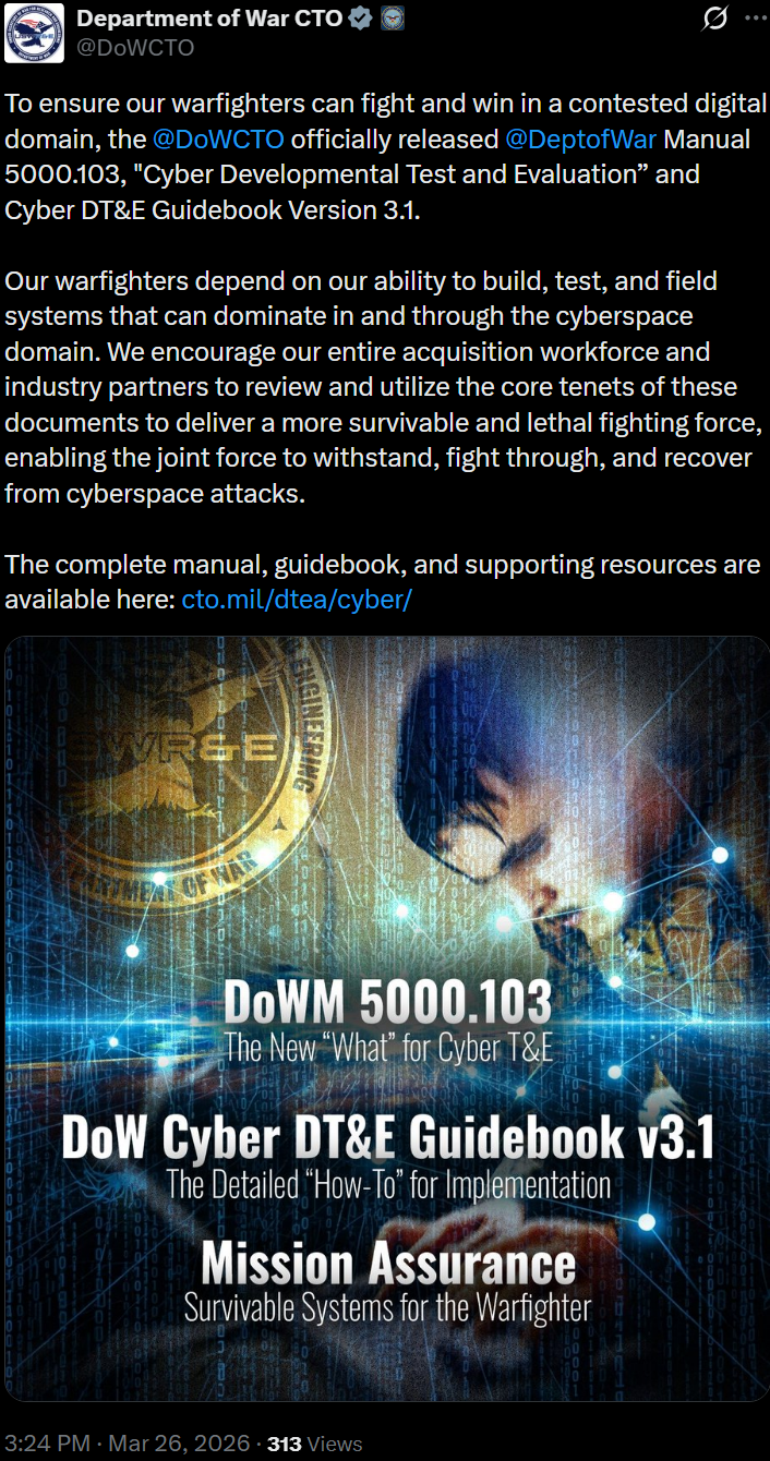[040]@DoWCTO officially released @DeptofWar Manual 5000.103, "Cyber Developmental Test and Evaluation” and Cyber DT&E Guidebook Version 3.1 media link media link