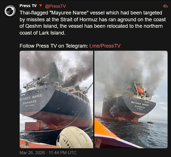 [118]Thai-flagged "Mayuree Naree" vessel which had been targeted by missiles at the Strait of Hormuz has ran aground on the coast of Qeshm Island,the vessel has been relocated to the northern coast of Lark Island media link