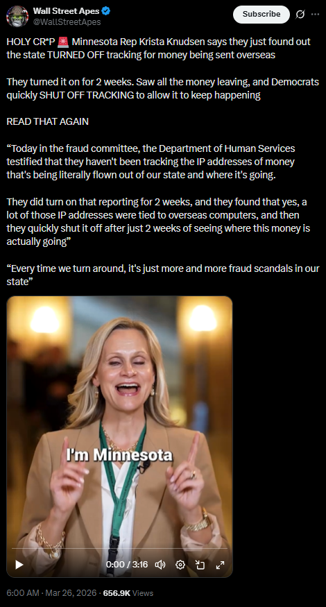 [076]Minnesota Rep Krista Knudsen says they just found out the state TURNED OFF tracking for money being sent overseas media link media link