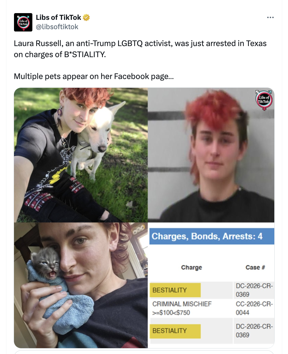 [109]BREAKING: Trans activist Laura Russell, who attends anti-Trump protests, was ARRESTED on charges of BESTIALITY. DEMONIC media link