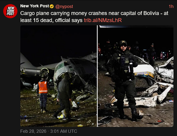 [120]@nypost: 1h Cargo plane carrying money crashes near capital of Bolivia - at least 15 dead, official says media link