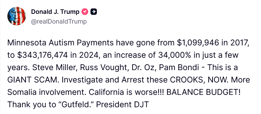 [117]@realDonaldTrump: Minnesota Autism Payments have gone from $1,099,946 in 2017, to $343,176,474 in 2024, an increase of 34,000% in just a few years... media link